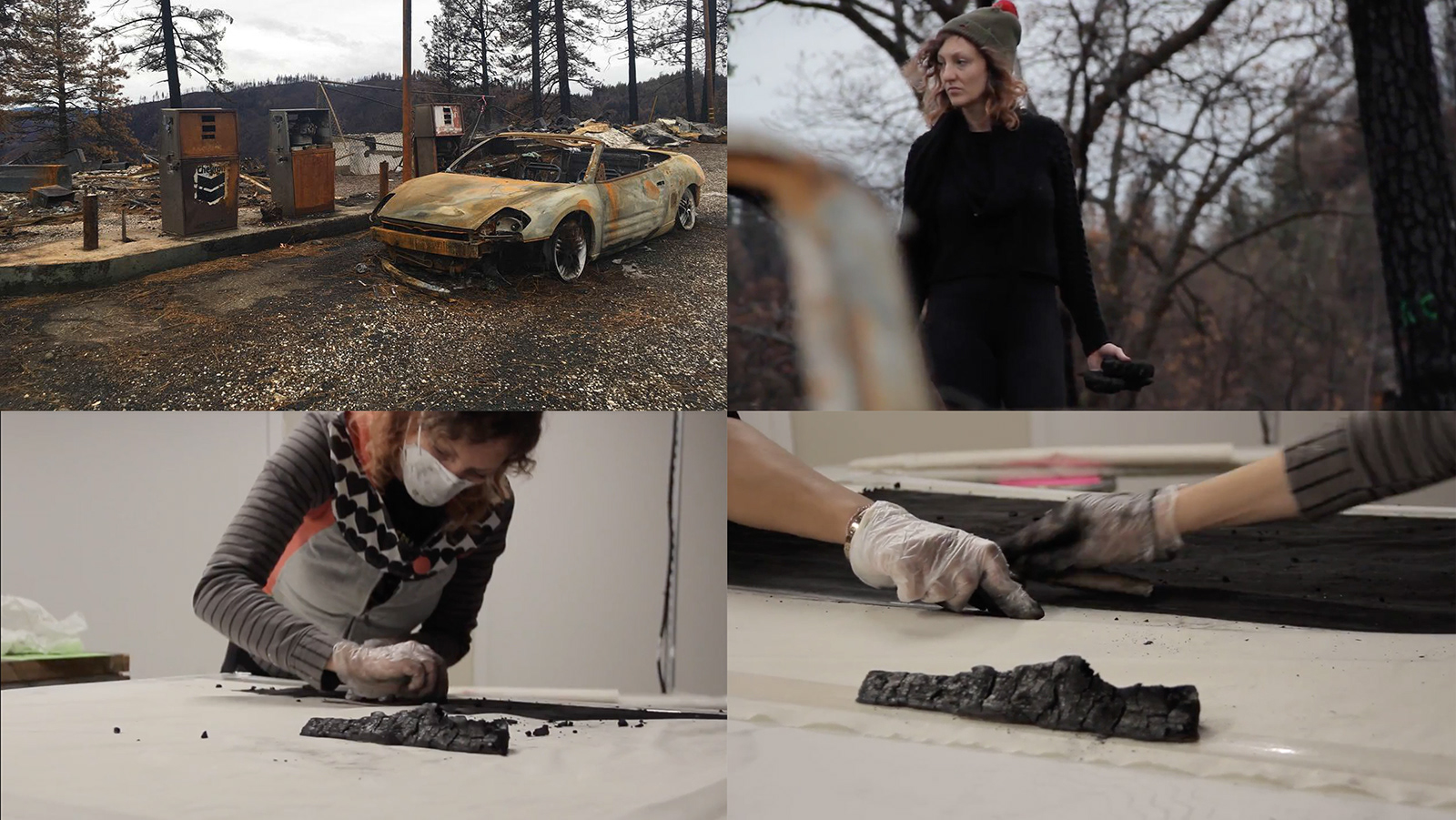 Since early 2019, I’ve been collecting burnt debris from wildfires and fires in the urban-interface zone in the western United States and using them to create “carbon paintings” that serve as markers of a changing climate and sustained forest mismanagement, existing in memoriam of the consequences of human habitation on the planet. I have collected from sites such as the Woolsey Fire in Malibu, the Camp Fire in Paradise, California, and the Troublesome Fire, Colorado among dozens of others throughout the mountain west, and each piece in the series corresponds to a specific fire. The reduced, fundamental material end result of these devastating events is the same as the cause—carbon—and this implicates each of us and our collective role as a part of, not apart from, the natural world. Western approaches of thinking, settling, managing and exploiting vast swaths of the earth is oppositional and has precipitated untenable circumstances. While naturally occurring fires are a vital part of ecosystems, we have induced a grave imbalance. last few fire seasons have made history, and mega blazes have leveled entire towns. Bearing witness to the burn scars myself post-fire is very impacting and allows me to document and understand from the ground.
