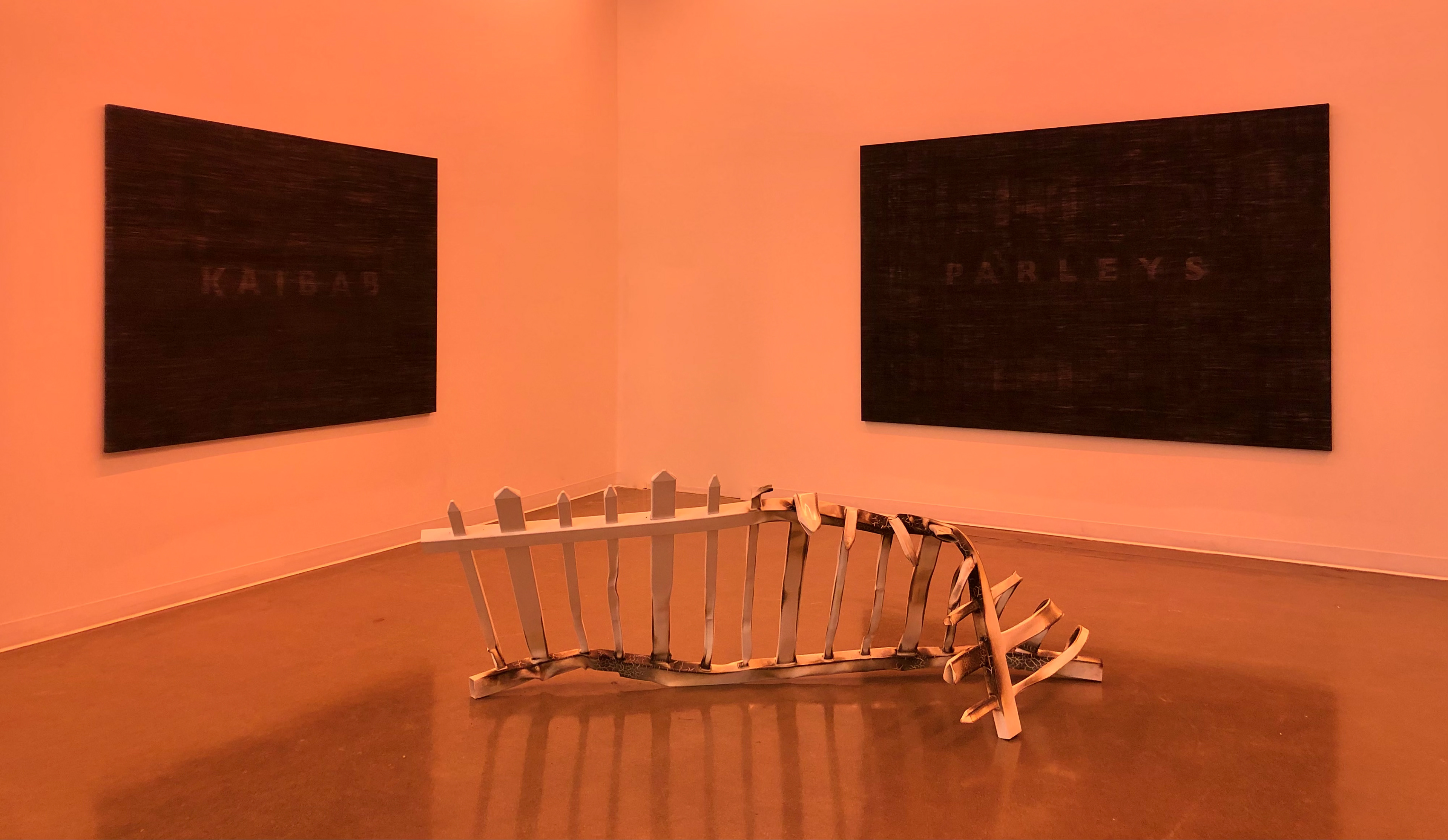 it doesn't look like paradise anymore, installation view, 2019, Souther Oregon University. "Camp Fire (Paradise)", 5'x8', 2019. "Woolsey Fire (Malibu)", 7'x11', 2019. "it doesn't look like paradise anymore (fence)", melted acrylic pre-fab fence, 4'x8', 2019.