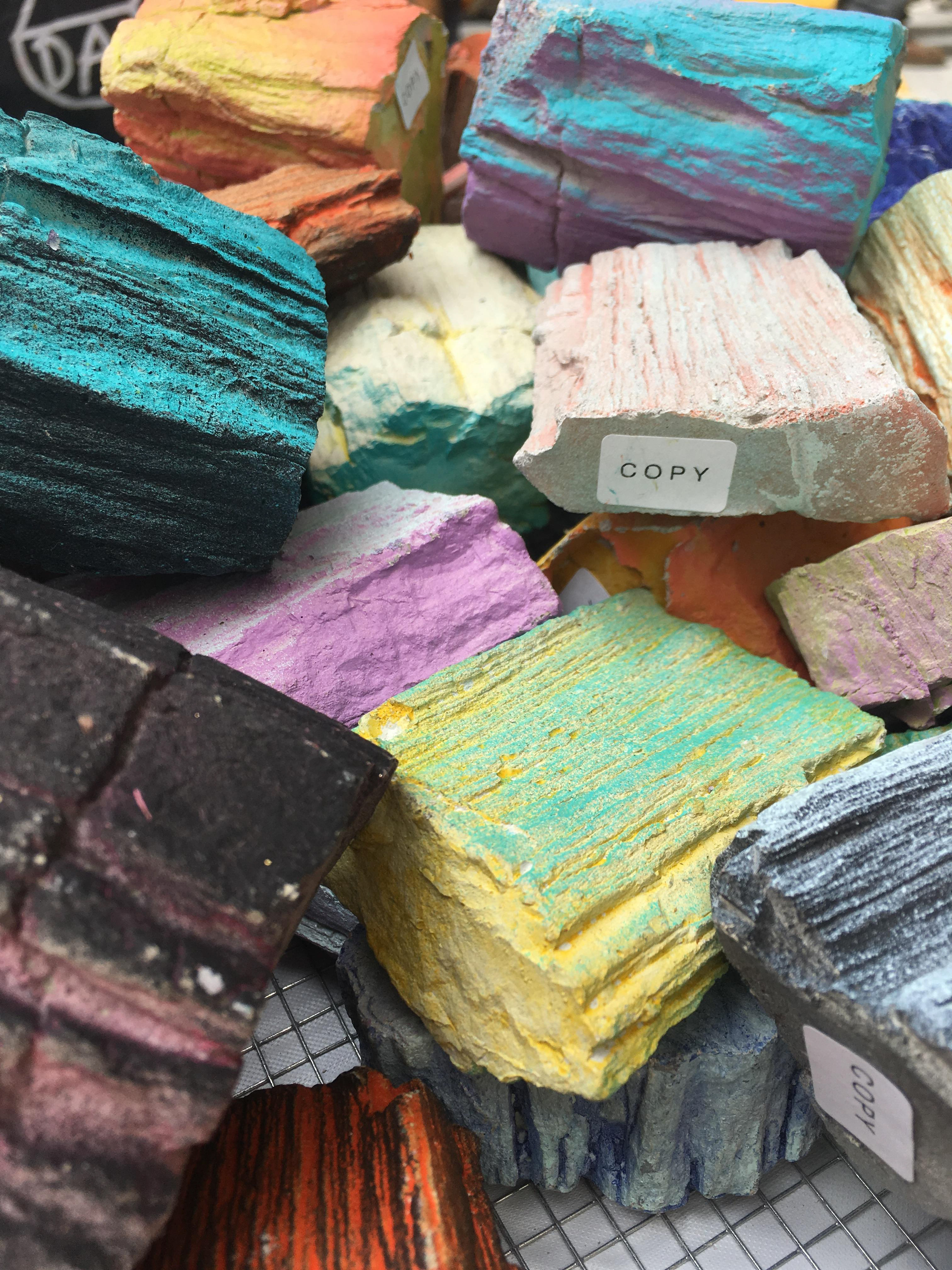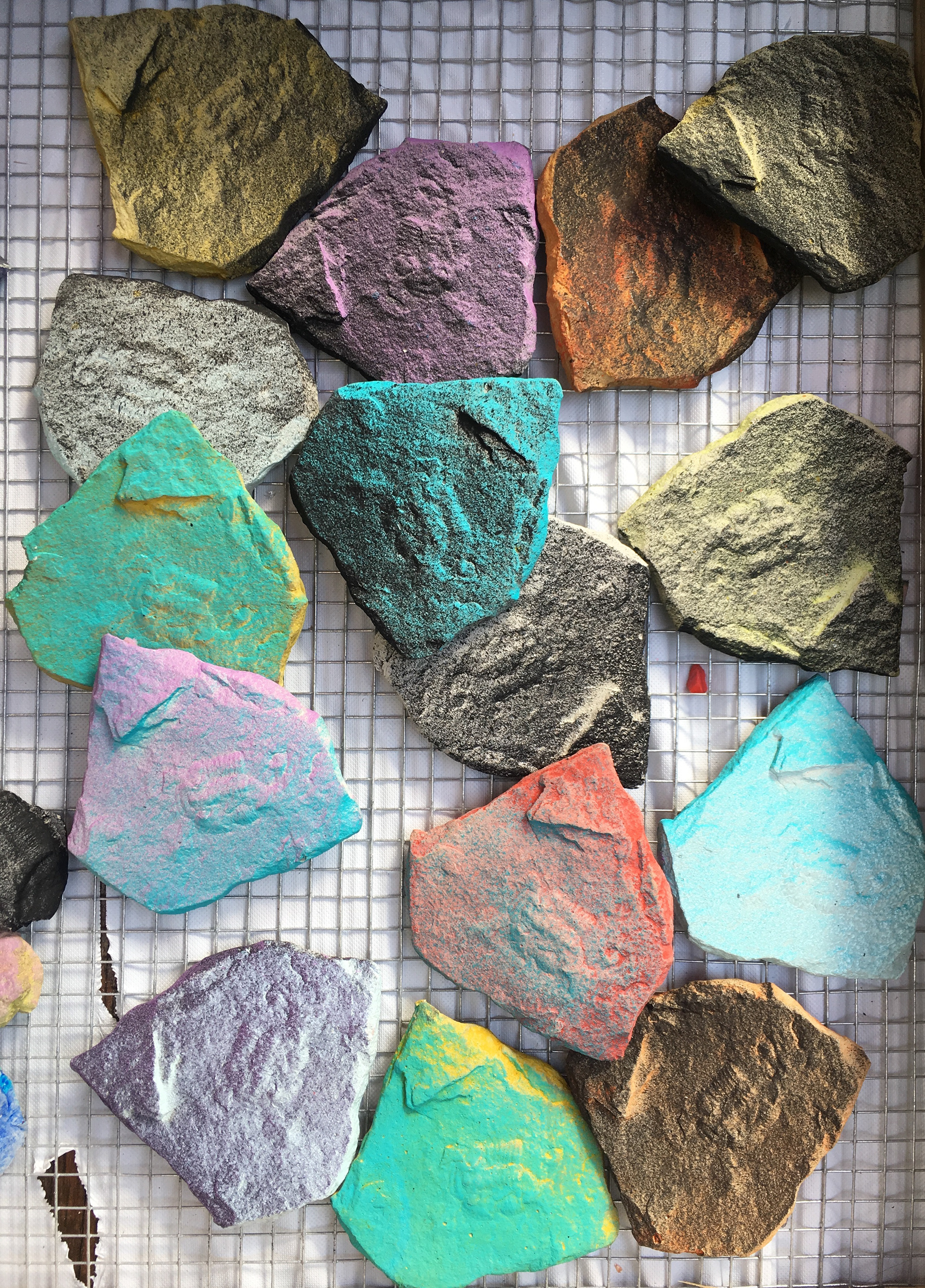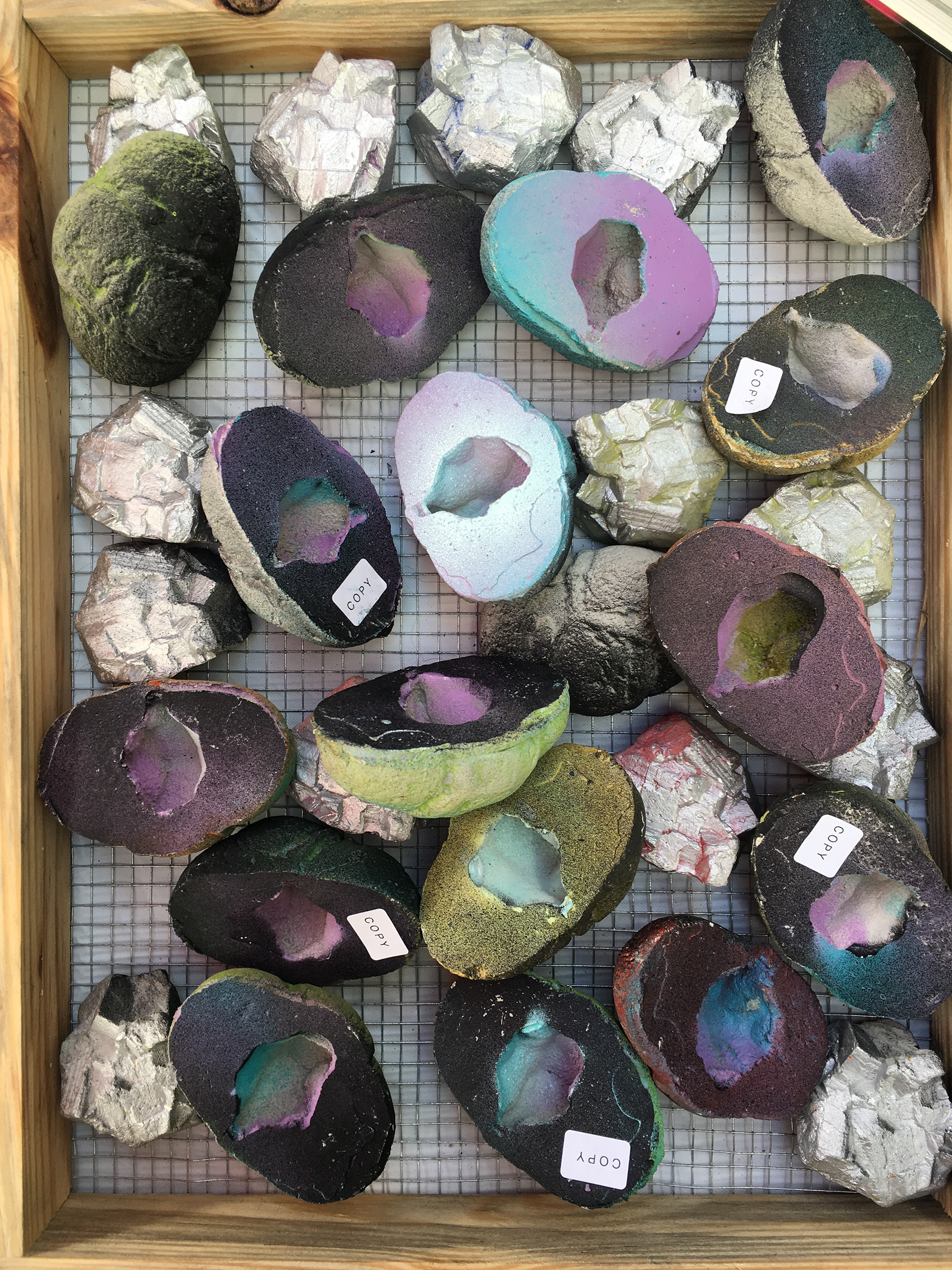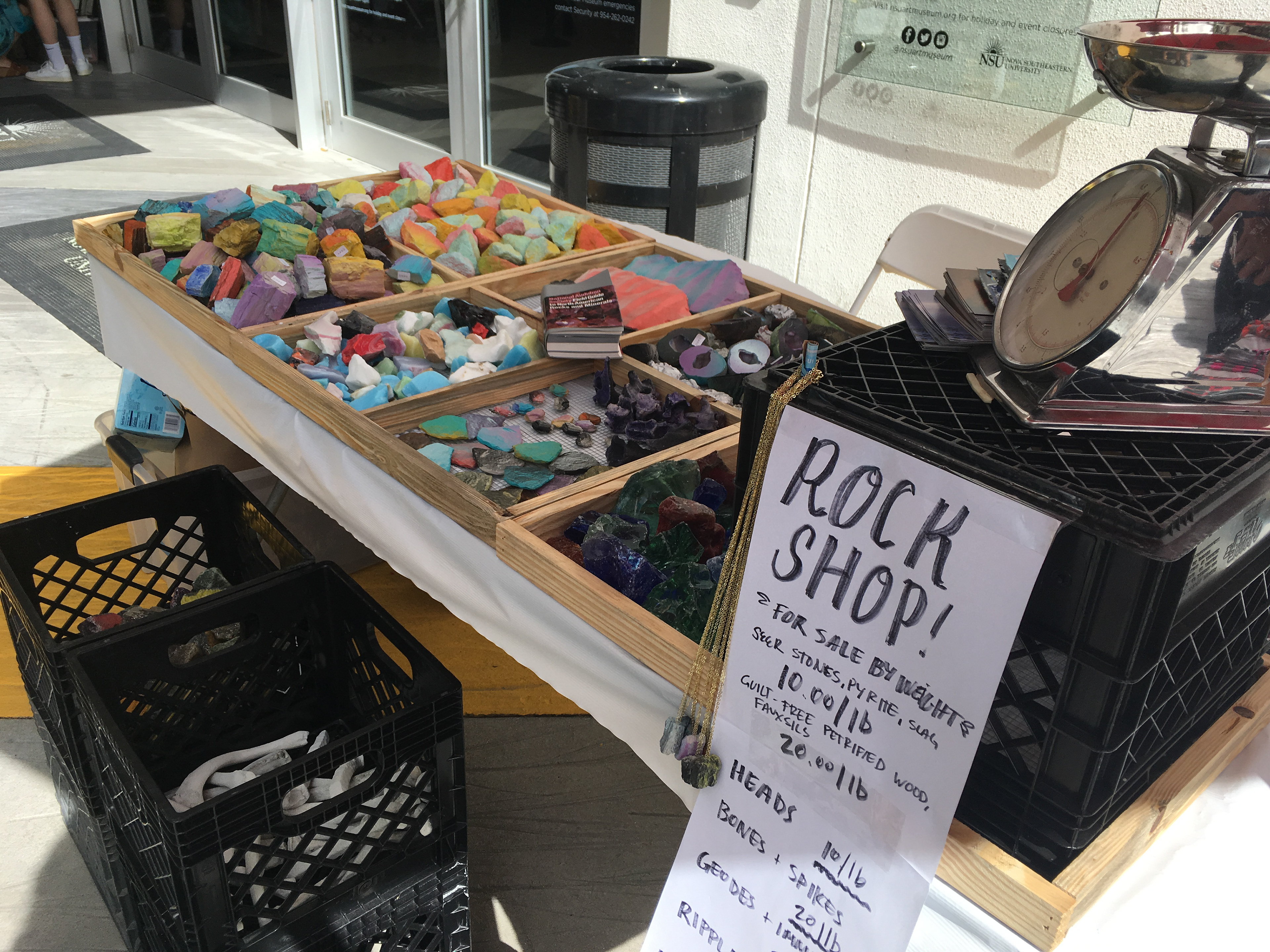 Rock Shop is an experiment (and mobile installation) I explored while in the storefront residency space at Mana Contemporary that continues threads in my work visualizing human impact on earth systems and human economy and what happens when earth objects become anthropological ones using the quotidian format of American roadside rock shops. This pseudo rock shop delves into the crassness of late capitalism and anthropogenic objects, the strangeness of talismans and the desire for uniqueness pitted against fast delivery. Garish concrete casts of real rocks and fossils I made and painted were for sale by weight in the souvenir district of downtown Miami, in a ghost mall. The rock knock-offs run parallel to systems of fast-fashion or commercial spiritualism, but are also self-aware, redundant objects that require mining, extraction and labor made to mimic earth’s raw materials, yet retain none of their value. The project continues on as a pop-up project at venues such as Rob Pruitt's Flea Market at NSU Museum, and an office Cold-War rock shop in conjunction with Fractured Landscapes at Hollywood Arts and Culture Center.